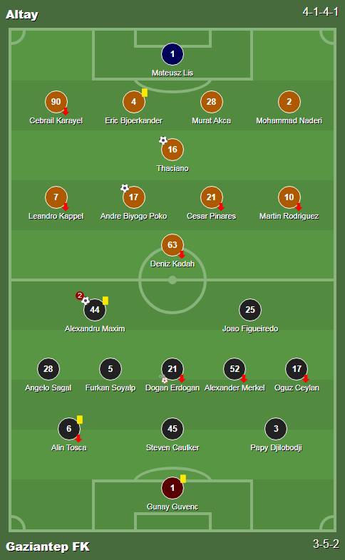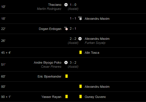 Goals: 10′ Thaciano (Martin Rodriguez(Assist)) / 18′ Alexandru Maxim / 22′ Dogan Erdogan / 26′ ((Assist)Alexandru Maxim) Furkan Soyalp / 51′ Andre Biyogo Poko (Cesar Pinares(Assist)) /