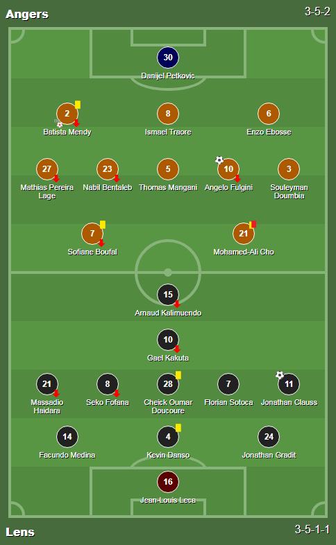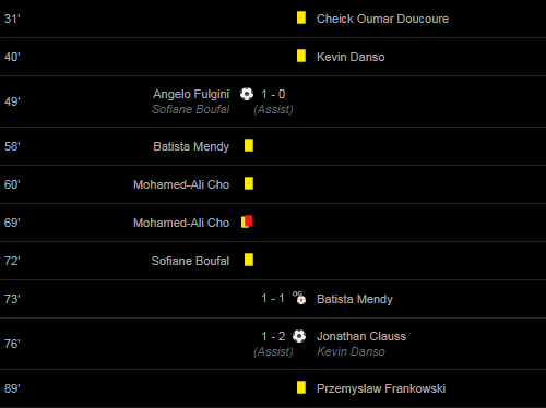 Cards: 31′ Cheick Oumar Doucoure / 40′ Kevin Danso / 58′ Batista Mendy / 60′ Mohamed-Ali Cho / 69′ Mohamed-Ali Cho / 72′ Sofiane Boufal / 89′ Przemyslaw Frankowski /