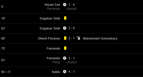 Goals: 5′ Veysel Sari (Fernando(Assist)) / 62′ Dogukan Sinik / 66′ Sherel Floranus / 81′ Fernando (Fredy(Assist)) / 90 + 5′ Naldo