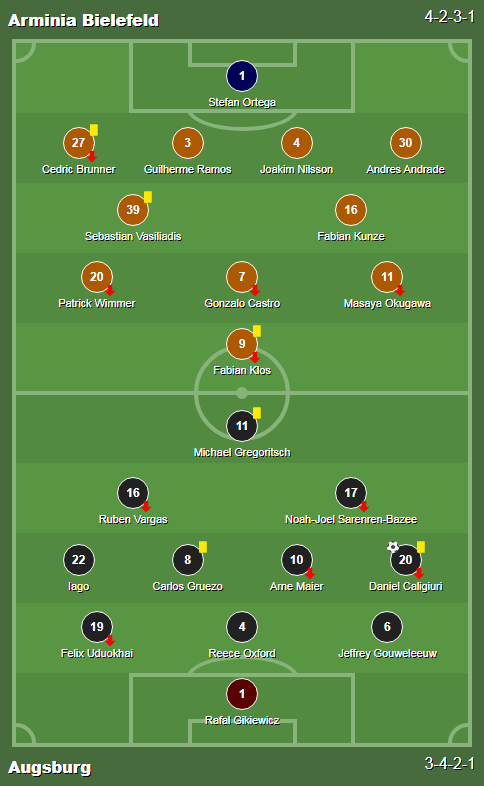 Cards: 21′ Daniel Caligiuri / 26′ Carlos Gruezo / 45 + 4′ Sebastian Vasiliadis / 54′ Fabian Klos / 73′ Michael Gregoritsch / 76′ Cedric Brunner / 78′ Mads Valentin Pedersen / 90 + 1′ Jan Moravek