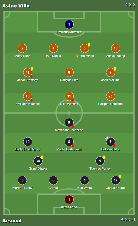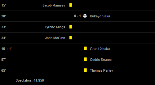 Cards: 15′ Jacob Ramsey / 33′ Tyrone Mings / 34′ John McGinn / 45 + 1′ Granit Xhaka / 57′ Cedric Soares / 65′ Thomas Partey