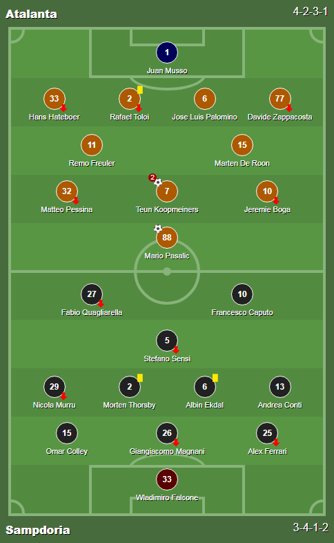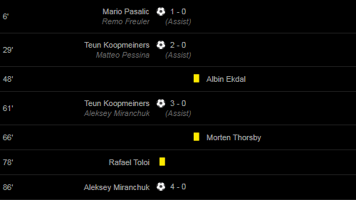 Goals: 6′ Mario Pasalic (Remo Freuler(Assist)) / 29′ Teun Koopmeiners (Matteo Pessina(Assist)) / 61′ Teun Koopmeiners (Aleksey Miranchuk(Assist)) / 86′ Aleksey Miranchuk /