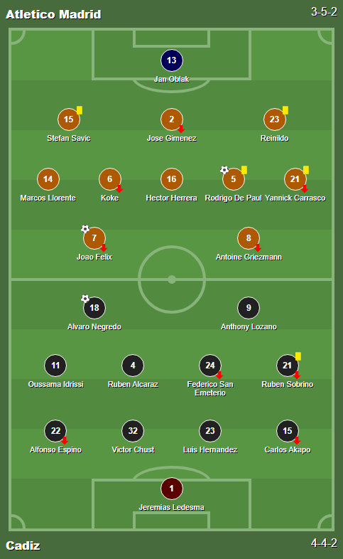 Cards: 30′ Rodrigo De Paul / 33′ Ruben Sobrino / 35′ Yannick Carrasco / 41′ Reinildo / 41′ Diego Simeone / 88′ Javier Serrano / 90 + 1′ Stefan Savic /