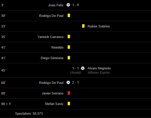 Cards: 30′ Rodrigo De Paul / 33′ Ruben Sobrino / 35′ Yannick Carrasco / 41′ Reinildo / 41′ Diego Simeone / 88′ Javier Serrano / 90 + 1′ Stefan Savic /