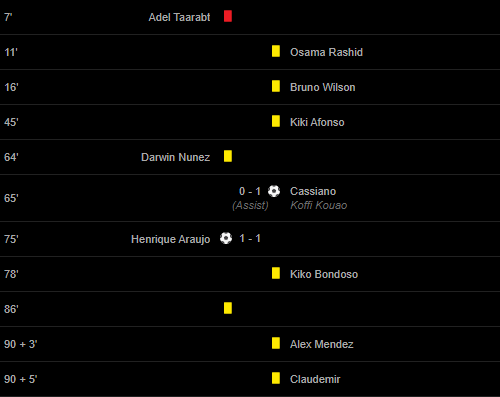 Cards: 7′ Adel Taarabt / 11′ Osama Rashid / 16′ Bruno Wilson / 45′ Kiki Afonso / 64′ Darwin Nunez / 78′ Kiko Bondoso / 86′ / 90 + 3′ Alex Mendez / 90 + 5′ Claudemir /