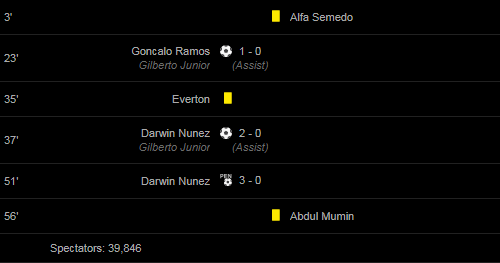 Goals: 23′ Goncalo Ramos (Gilberto Junior(Assist)) / 37′ Darwin Nunez (Gilberto Junior(Assist)) / 51′ Darwin Nunez /