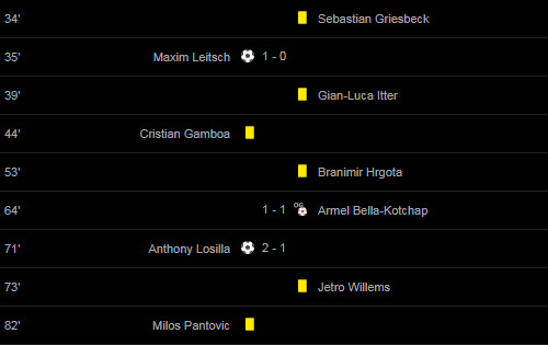Cards: 34′ Sebastian Griesbeck / 39′ Gian-Luca Itter / 44′ Cristian Gamboa / 53′ Branimir Hrgota / 73′ Jetro Willems / 82′ Milos Pantovic