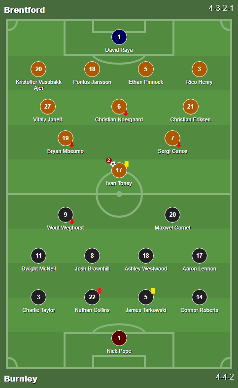 Cards: 86′ Ivan Toney / 89′ James Tarkowski / 90 + 2′ Nathan Collins