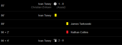 Goals: 85′ Ivan Toney (Christian Eriksen(Assist)) / 90 + 4′ Ivan Toney