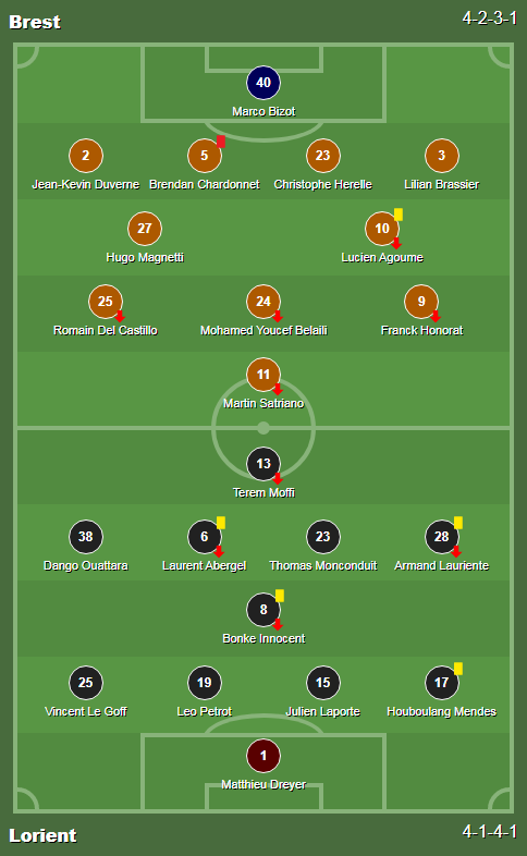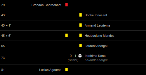 Cards: 29′ Brendan Chardonnet / 43′ Bonke Innocent / 45 + 1′ Armand Lauriente / 45 + 5′ Houboulang Mendes / 65′ Laurent Abergel / 81′ Lucien Agoume
