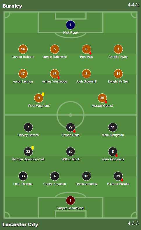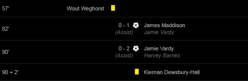 Goals: 82′ ((Assist)James Maddison) Jamie Vardy / 90′ ((Assist)Jamie Vardy) Harvey Barnes / 90 + 2′
