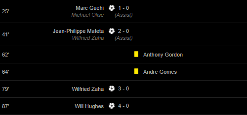 Goals: 25′ Marc Guehi (Michael Olise(Assist)) / 41′ (Wilfried Zaha2 – 0) (Assist) / 79′ Wilfried Zaha / 87′ Will Hughes