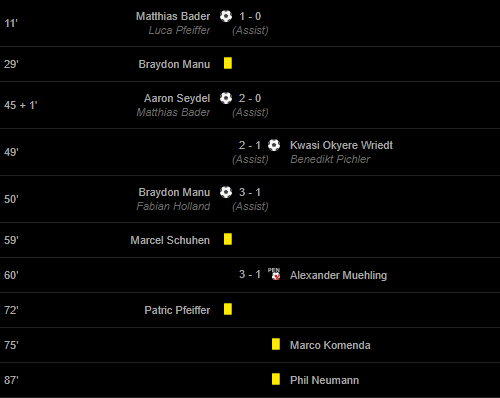 Goals: 11′ Matthias Bader (Luca Pfeiffer(Assist)) / 45 + 1′ Aaron Seydel (Matthias Bader(Assist)) / 49′ ((Assist)Kwasi Okyere Wriedt) Benedikt Pichler / 50′ Braydon Manu (Fabian Holland(Assist)) / 60′ Alexander Muehling /