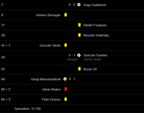 Cards: 8′ Antonio Barragan / 27′ Dimitri Foulquier / 39′ Mouctar Diakhaby / 45 + 1′ Gonzalo Verdu / 65′ Bryan Gil / 90 + 2′ Johan Mojica / 90 + 3′ Fidel Chaves