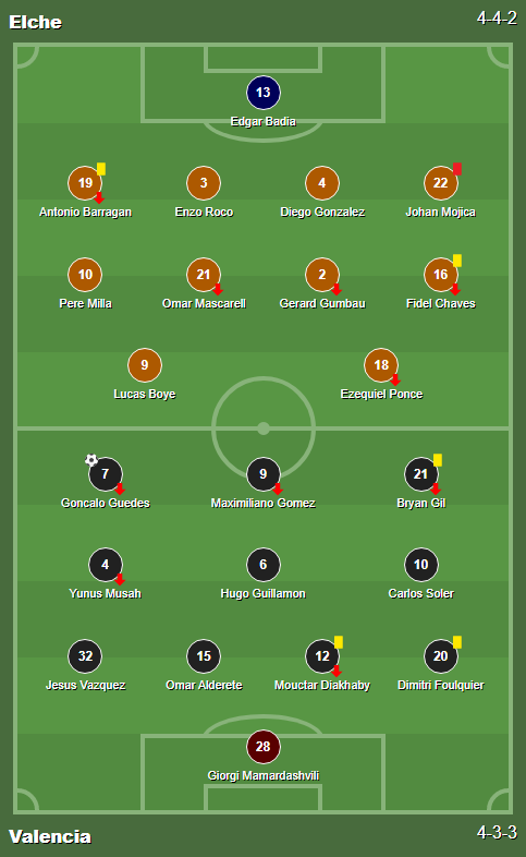 Goals: 7′ Hugo Guillamon / 50′ ((Assist)Goncalo Guedes) Carlos Soler / 66′ Giorgi Mamardashvili