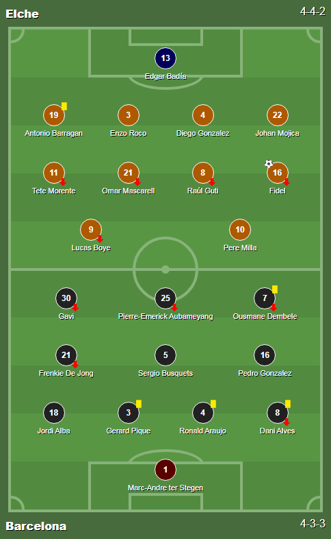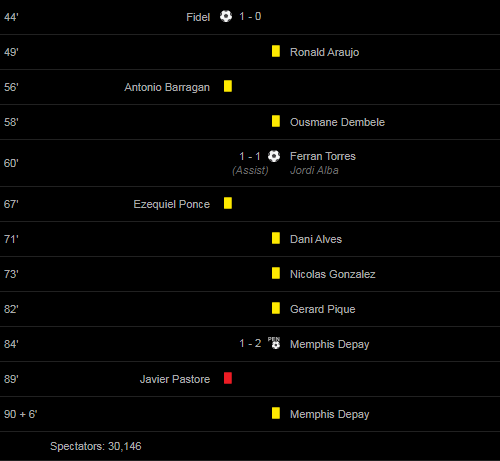 Cards: 49′ Ronald Araujo / 56′ Antonio Barragan / 58′ Ousmane Dembele / 67′ Ezequiel Ponce / 71′ Dani Alves / 73′ Nicolas Gonzalez / 82′ Gerard Pique / 89′ Javier Pastore / 90 + 6′ Memphis Depay