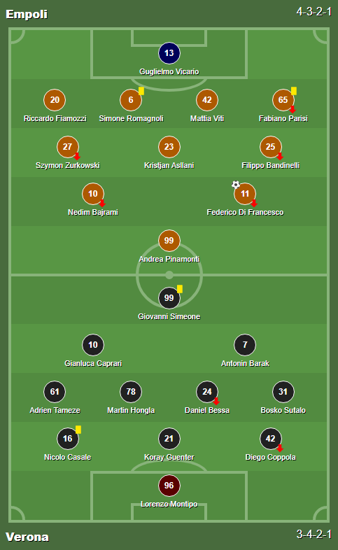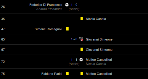 Cards: 35′ Nicolo Casale / 47′ Simone Romagnoli / 67′ Giovanni Simeone / 75′ Fabiano Parisi Matteo Cancellieri
