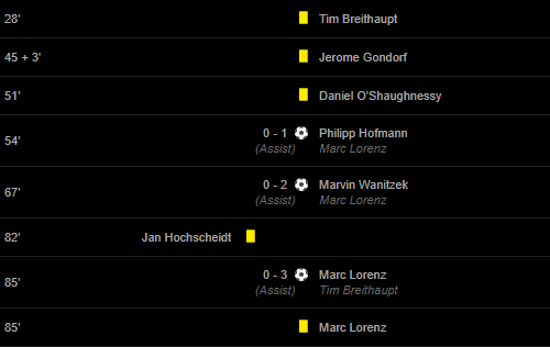 Cards: 28′ Tim Breithaupt / 45 + 3′ Jerome Gondorf / 51′ Daniel O’Shaughnessy / 82′ Jan Hochscheidt / 85′ Marc Lorenz