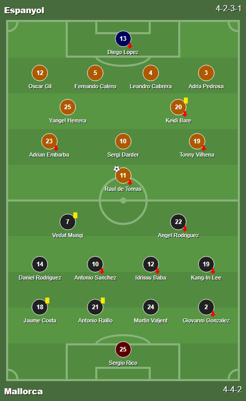 Cards: 9′ Jaume Costa / 23′ Keidi Bare / 37′ Vedat Muriqi / 62′ Antonio Raillo / 81′ Manu Morlanes / 81′ Aleix Vidal