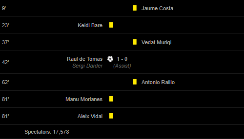 Cards: 9′ Jaume Costa / 23′ Keidi Bare / 37′ Vedat Muriqi / 62′ Antonio Raillo / 81′ Manu Morlanes / 81′ Aleix Vidal