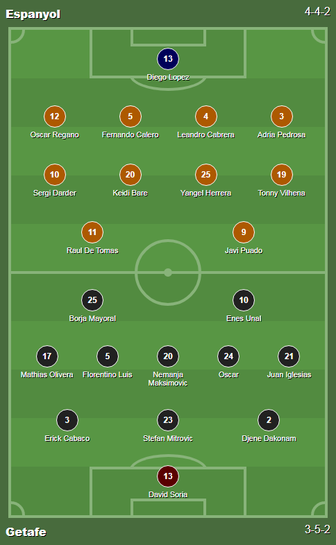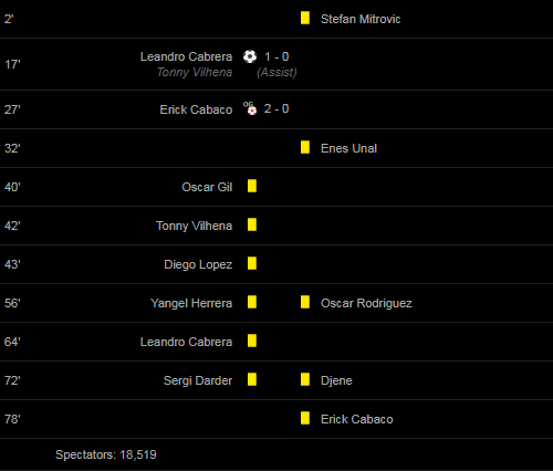 Cards: 2′ Stefan Mitrovic / 32′ Enes Unal / 40′ Oscar Gil / 42′ Tonny Vilhena / 43′ Diego Lopez / 56′ Yangel Herrera Oscar Rodriguez / 64′ Leandro Cabrera / 72′ Sergi Darder Djene / 78′ Erick Cabaco