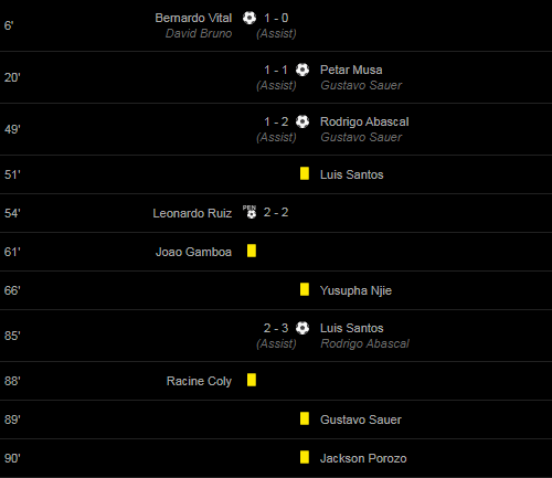 Goals: 6′ Bernardo Vital (David Bruno(Assist)) / 20′ ((Assist)Petar Musa) Gustavo Sauer / 49′ ((Assist)Rodrigo Abascal) Gustavo Sauer / 54′ Leonardo Ruiz / 85′ ((Assist)Luis Santos) Rodrigo Abascal /