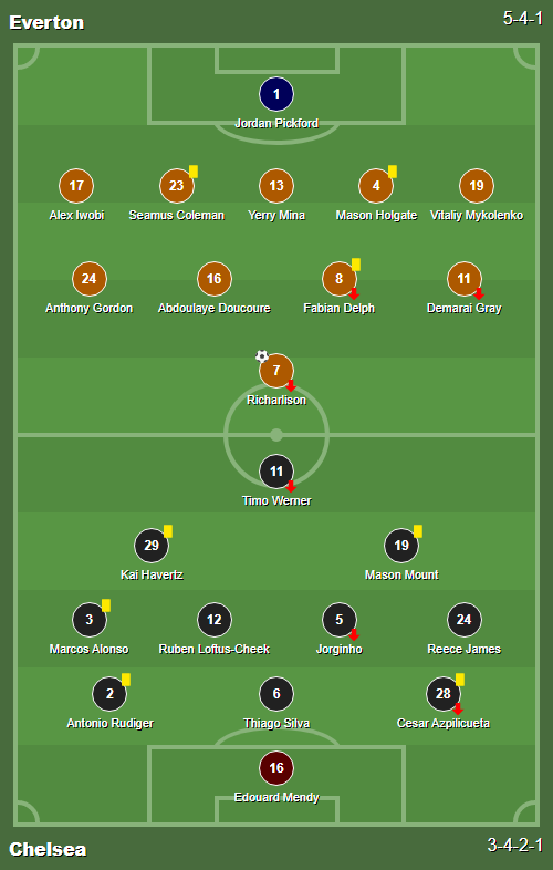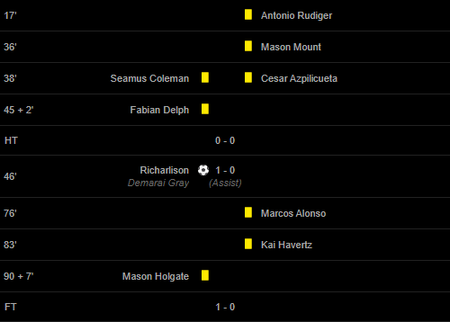 Cards: 17′ Antonio Rudiger / 36′ Mason Mount / 38′ Seamus Coleman Cesar Azpilicueta / 45 + 2′ Fabian Delph / 76′ Marcos Alonso / 83′ Kai Havertz / 90 + 7′ Mason Holgate /