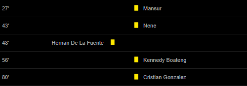 Cards: 27′ Mansur / 43′ Nene / 48′ Hernan De La Fuente / 56′ Kennedy Boateng / 80′ Cristian Gonzalez