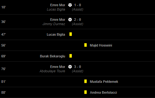 Goals: 10′ Emre Mor (Lucas Biglia(Assist)) / 36′ Emre Mor (Jimmy Durmaz(Assist)) / 76′ Emre Mor (Abdoulaye Toure(Assist))