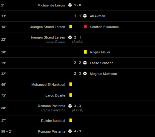 Goals: 2′ Michael de Leeuw / 13′ Ali Akman / 22′ Joergen Strand Larsen (Laros Duarte(Assist)) / 29′ Lasse Schoene / 32′ Magnus Mattsson / 80′ Romano Postema (Damil Dankerlui(Assist)) / 90 + 2′ Romano Postema /