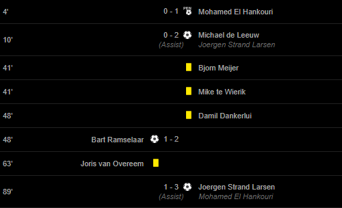 Goals: 4′ Mohamed El Hankouri / 10′ ((Assist)Michael de Leeuw) Joergen Strand Larsen / 48′ Bart Ramselaar / 89′ ((Assist)Joergen Strand Larsen) Mohamed El Hankouri