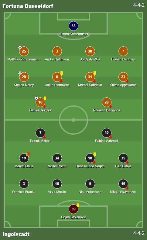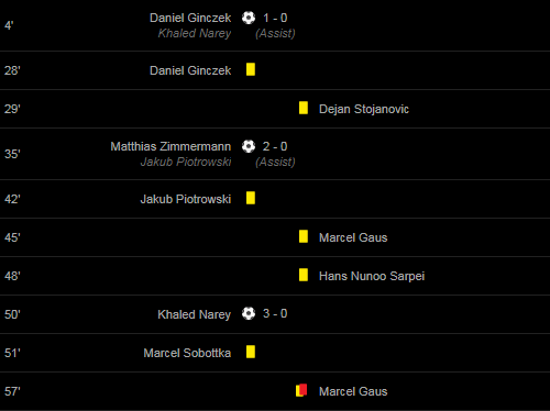 Cards: 28′ Daniel Ginczek / 29′ Dejan Stojanovic / 42′ Jakub Piotrowski / 45′ Marcel Gaus / 48′ Hans Nunoo Sarpei / 51′ Marcel Sobottka / 57′ Marcel Gaus