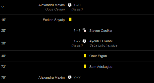 Goals: 5′ Alexandru Maxim (Oguz Ceylan(Assist)) / 20′ Steven Caulker / 30′ ((Assist)Ayoub El Kaabi) Saba Lobzhanidze / 79′ Alexandru Maxim /