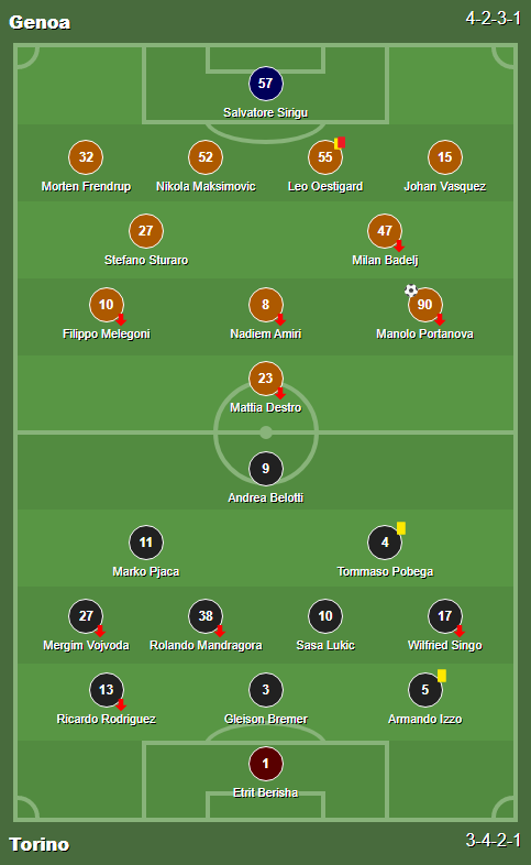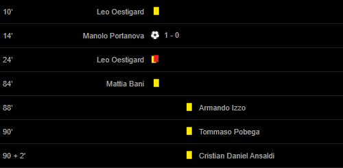 Cards: 10′ Leo Oestigard / 24′ Leo Oestigard / 84′ Mattia Bani / 88′ Armando Izzo / 90′ Tommaso Pobega / 90 + 2′ Cristian Daniel Ansaldi