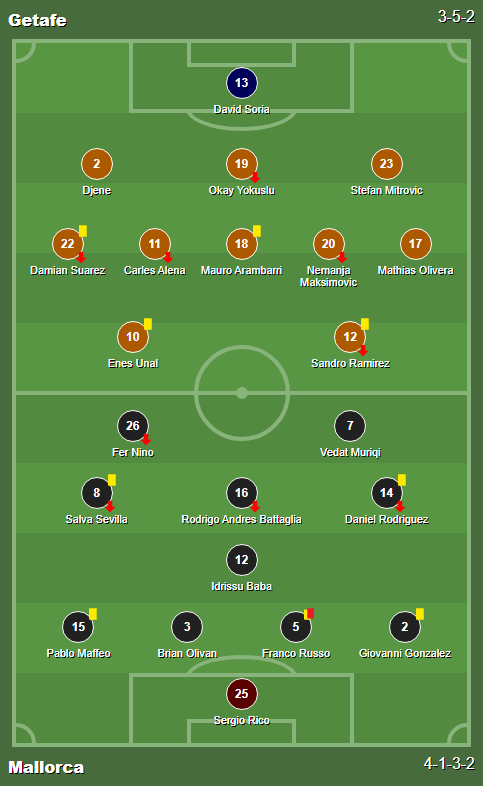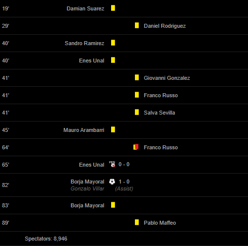 Cards: 19′ Damian Suarez / 29′ Daniel Rodriguez / 40′ Sandro Ramirez / 40′ Enes Unal / 41′ Giovanni Gonzalez / 41′ Franco Russo / 41′ Salva Sevilla / 45′ Mauro Arambarri / 64′ Franco Russo / 83′ Borja Mayoral / 89′ Pablo Maffeo /
