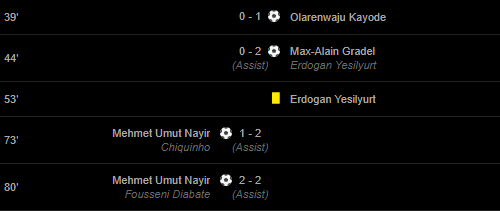 Goals: 39′ Olarenwaju Kayode / 44′ ((Assist)Max-Alain Gradel) Erdogan Yesilyurt / 73′ Mehmet Umut Nayir (Chiquinho(Assist)) / 80′ Mehmet Umut Nayir (Fousseni Diabate(Assist)) /