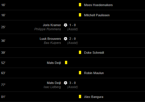 Goals: 25′ Joris Kramer (Philippe Rommens(Assist)) / 36′ Luuk Brouwers (Bas Kuipers(Assist)) / 77′ Mats Deijl (Isac Lidberg(Assist))