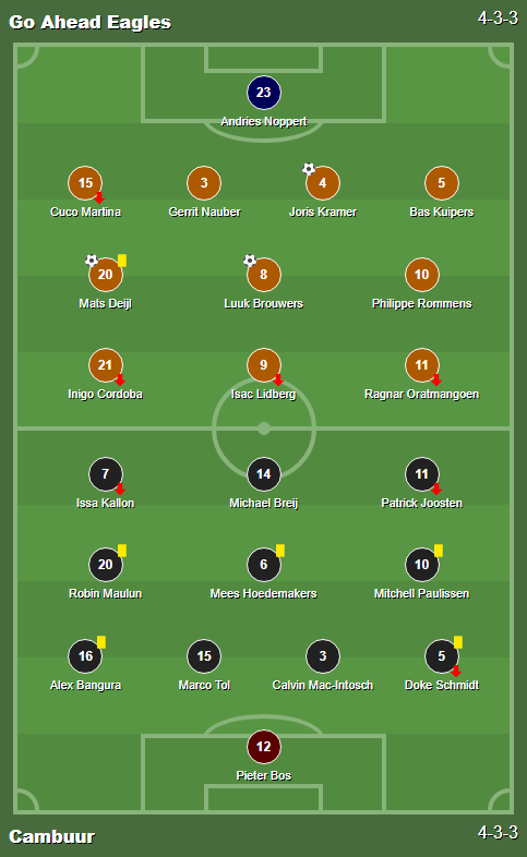 Cards: 16′ Mees Hoedemakers / 16′ Mitchell Paulissen / 39′ Doke Schmidt / 52′ Mats Deijl / 63′ Robin Maulun / 81′ Alex Bangura