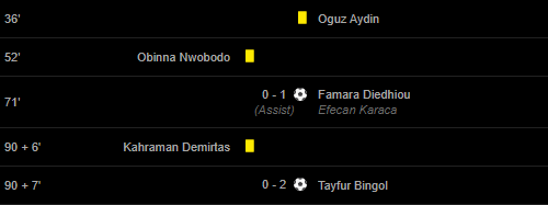 Goals: 71′ ((Assist)Famara Diedhiou) Efecan Karaca / 90 + 7′ Tayfur Bingol