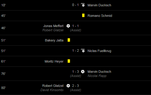 Goals: 10′ Marvin Ducksch / 46′ Jonas Meffert (Robert Glatzel(Assist)) / 51′ Niclas Fuellkrug / 76′ ((Assist)Marvin Ducksch) Nicolai Rapp / 80′ Robert Glatzel (David Kinsombi(Assist)) /