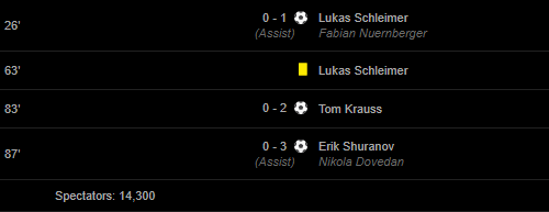 Goals: 26′ ((Assist)Lukas Schleimer) Fabian Nuernberger / 83′ Tom Krauss / 87′ ((Assist)Erik Shuranov) Nikola Dovedan /