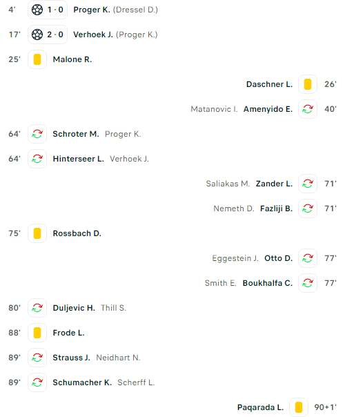 Yellow Cards: 25 Malone R. / 26 Daschner L. / 75 Rossbach D. / 88 Frode L. / 90+1 Paqarada L. /