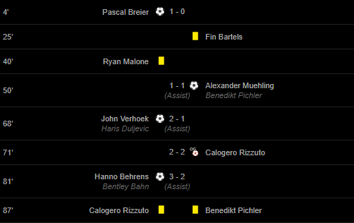 Cards: 25′ Fin Bartels / 40′ Ryan Malone / 87′ Calogero Rizzuto Benedikt Pichler /