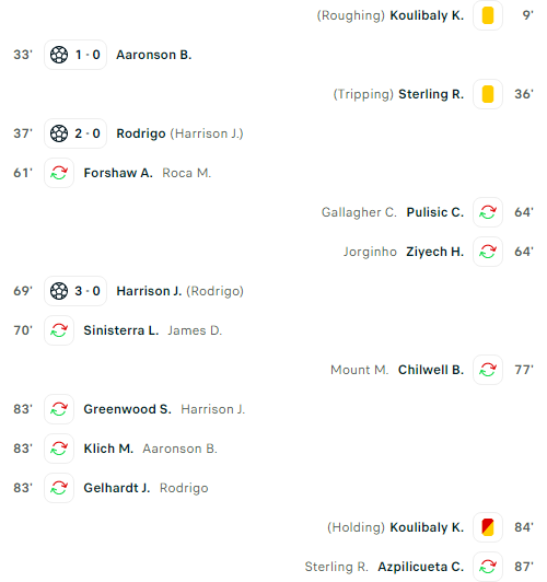 Goals: 33’1 – 0Aaronson B. / 37’2 – 0Rodrigo(Assist Harrison J.) / 69’3 – 0Harrison J.(Assist Rodrigo) /