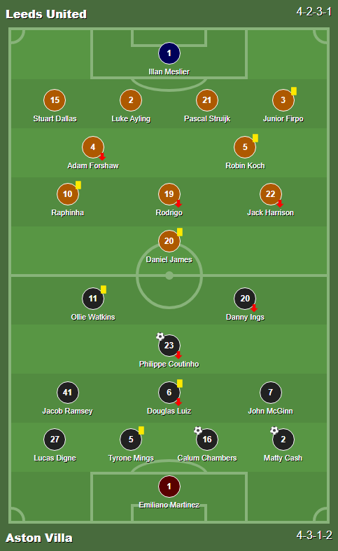 Cards: 17′ Ollie Watkins / 45 + 1′ Robin Koch / 48′ Tyrone Mings / 62′ Douglas Luiz / 68′ Joe Gelhardt / 81′ Junior Firpo / 86′ Daniel James / 90 + 2′ Raphinha /