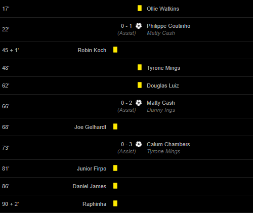 Goals: 22′ ((Assist)Philippe Coutinho) Matty Cash / 66′ ((Assist)Matty Cash) Danny Ings / 73′ ((Assist)Calum Chambers) Tyrone Mings /