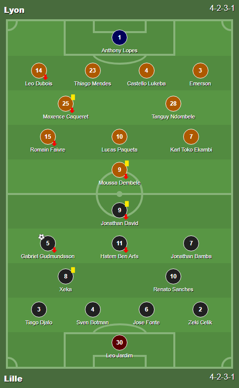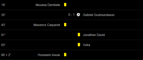 Cards: 18′ Moussa Dembele / 43′ Maxence Caqueret / 81′ Jonathan David / 83′ Xeka / 90 + 2′ Houssem Aouar