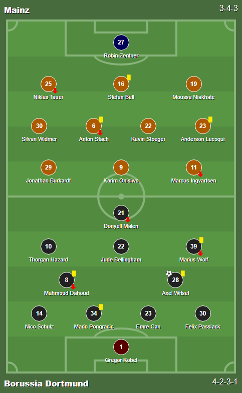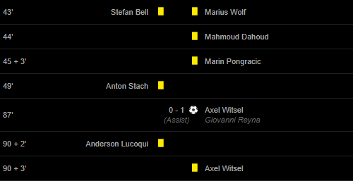 Cards: 43′ Stefan Bell Marius Wolf / 44′ Mahmoud Dahoud / 45 + 3′ Marin Pongracic / 49′ Anton Stach / 90 + 2′ Anderson Lucoqui / 90 + 3′ Axel Witsel
