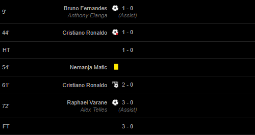 Goals: 9′ Bruno Fernandes (Anthony Elanga(Assist)) / 44′ Cristiano Ronaldo / 61′ Cristiano Ronaldo / 72′ Raphael Varane (Alex Telles(Assist)) /