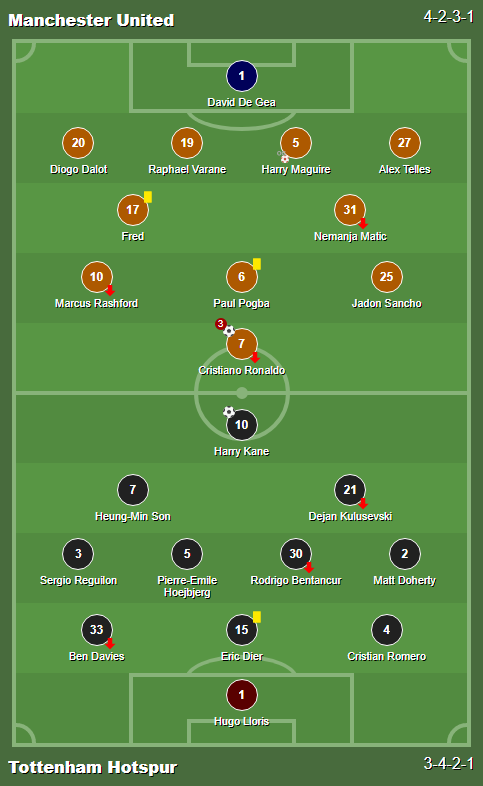 Goals: 12′ Cristiano Ronaldo (Fred(Assist)) / 35′ Harry Kane / 38′ Cristiano Ronaldo (Jadon Sancho(Assist)) / 72′ Harry Maguire / 81′ Cristiano Ronaldo (Alex Telles(Assist))